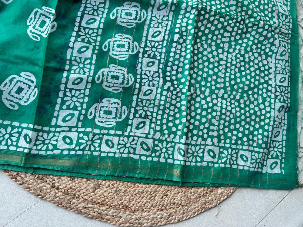 This green saree features an intricate boutique print that showcases craftsmanship, blending traditional weaving techniques with refined design sensibilities. The natural silk composition offers superior breathability and a luxurious feel against the skin.
